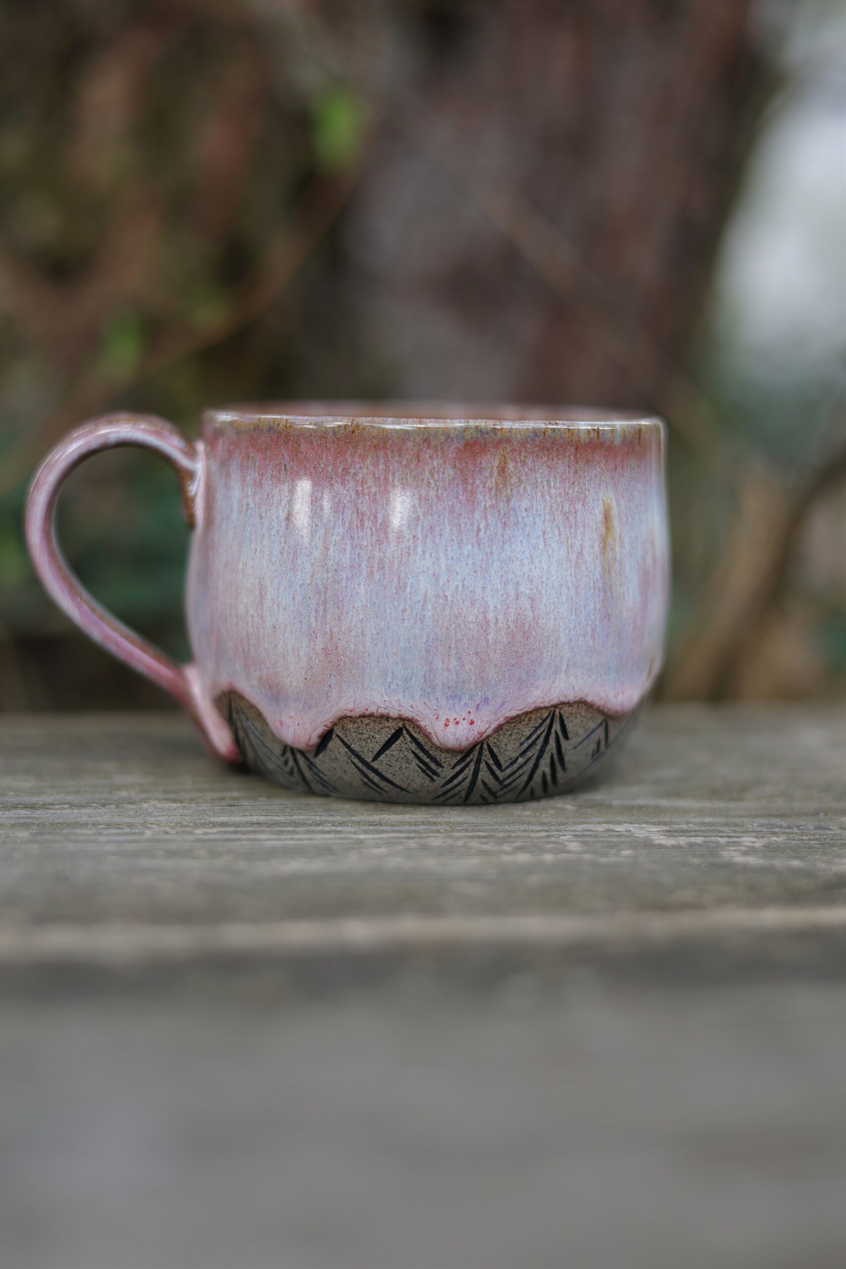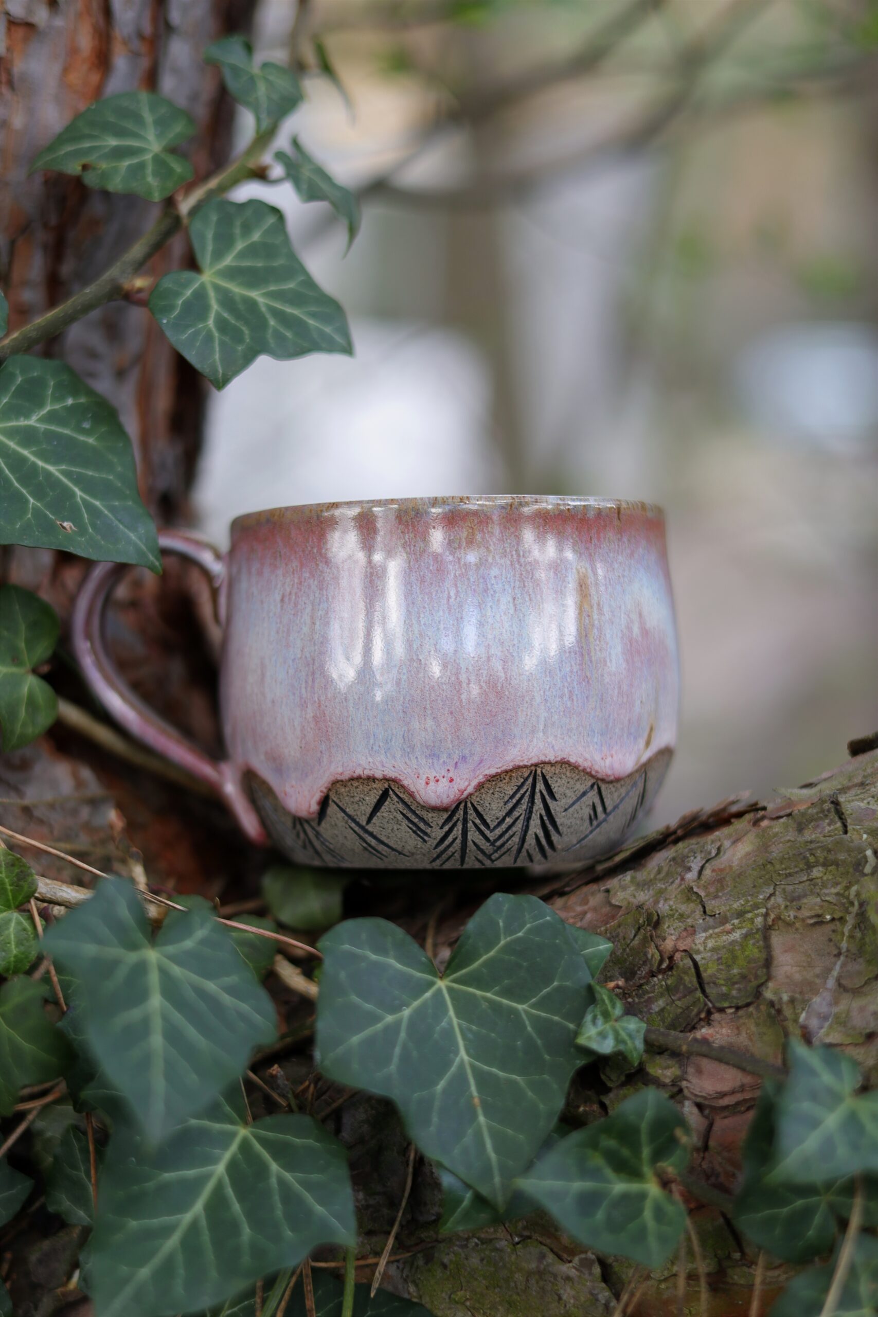 Kubek wykonałam na kole garncarskim z szarej gliny. Nie jest idealny i posiada ślady moich rąk. Poszkliwiony został szkliwem przeznaczonym do kontaktu z żywnością oraz wypalony w wysokiej temperaturze odpowiedniej do użytej gliny. Nie ma dwóch takich samych kubków, mogą delikatnie różnić się od siebie pojemnością, kształtem, wzorem i efektami na szkliwie. Kolor szkliwa może nieznacznie różnić się od tego na zdjęciach. Ceramikę można myć w zmywarce, ale by dłużej cieszyć się pięknym szkliwem zalecam mycie ręczne.