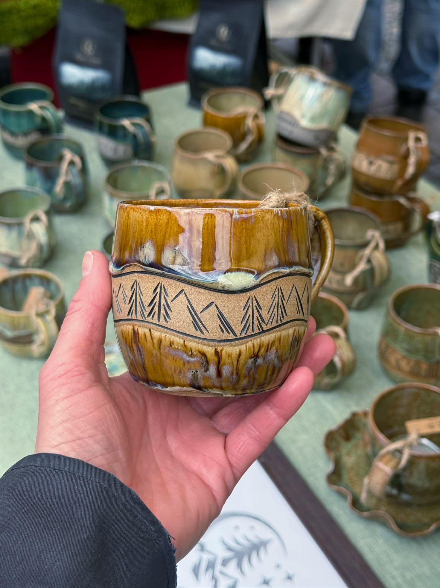 Kubek wykonałam na kole garncarskim z beżowej gliny. Nie jest idealny i posiada ślady moich rąk. Poszkliwiony został szkliwem przeznaczonym do kontaktu z żywnością oraz wypalony w wysokiej temperaturze odpowiedniej do użytej gliny. Nie ma dwóch takich samych kubków, mogą delikatnie różnić się od siebie pojemnością, kształtem, wzorem i efektami na szkliwie. Kolor szkliwa może nieznacznie różnić się od tego na zdjęciach. Ceramikę można myć w zmywarce, ale by dłużej cieszyć się pięknym szkliwem zalecam mycie ręczne.