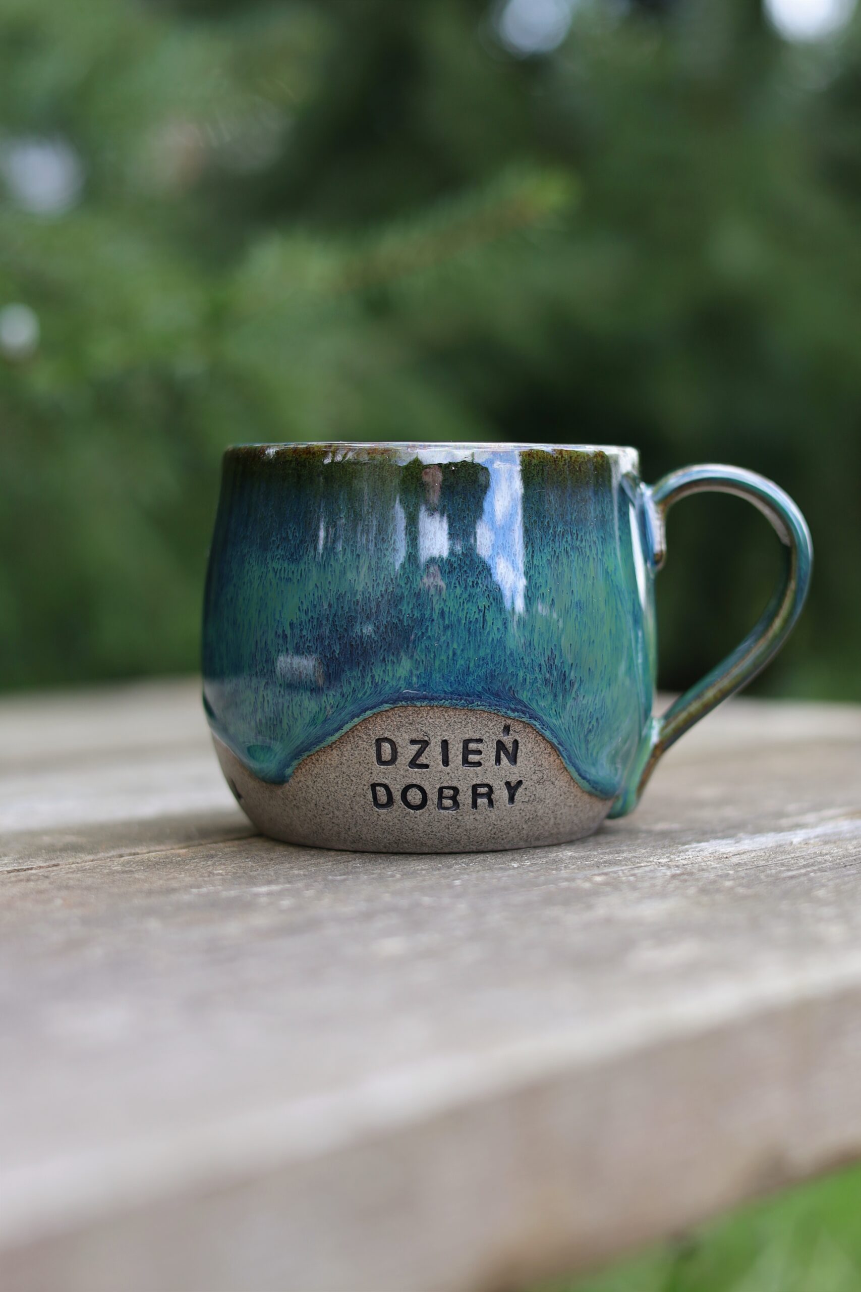 Kubek wykonałam na kole garncarskim z szarej gliny. Nie jest idealny i posiada ślady moich rąk. Poszkliwiony został szkliwem przeznaczonym do kontaktu z żywnością oraz wypalony w wysokiej temperaturze odpowiedniej do użytej gliny. Nie ma dwóch takich samych kubków, mogą delikatnie różnić się od siebie pojemnością, kształtem, wzorem i efektami na szkliwie. Kolor szkliwa może nieznacznie różnić się od tego na zdjęciach. Ceramikę można myć w zmywarce, ale by dłużej cieszyć się pięknym szkliwem zalecam mycie ręczne.