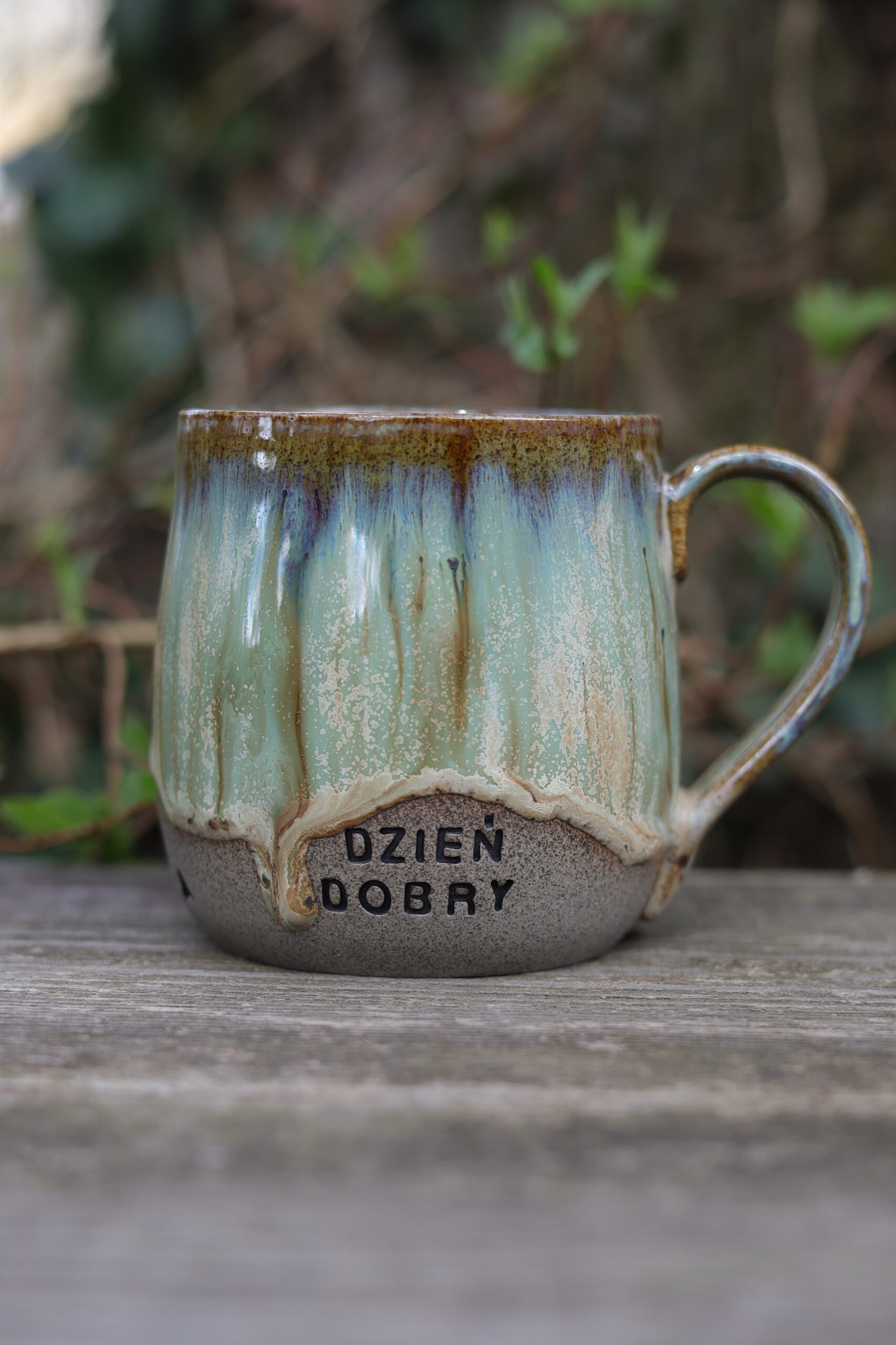 Kubek wykonałam na kole garncarskim z szarej gliny. Nie jest idealny i posiada ślady moich rąk. Poszkliwiony został szkliwem przeznaczonym do kontaktu z żywnością oraz wypalony w wysokiej temperaturze odpowiedniej do użytej gliny. Nie ma dwóch takich samych kubków, mogą delikatnie różnić się od siebie pojemnością, kształtem, wzorem i efektami na szkliwie. Kolor szkliwa może nieznacznie różnić się od tego na zdjęciach. Ceramikę można myć w zmywarce, ale by dłużej cieszyć się pięknym szkliwem zalecam mycie ręczne.
