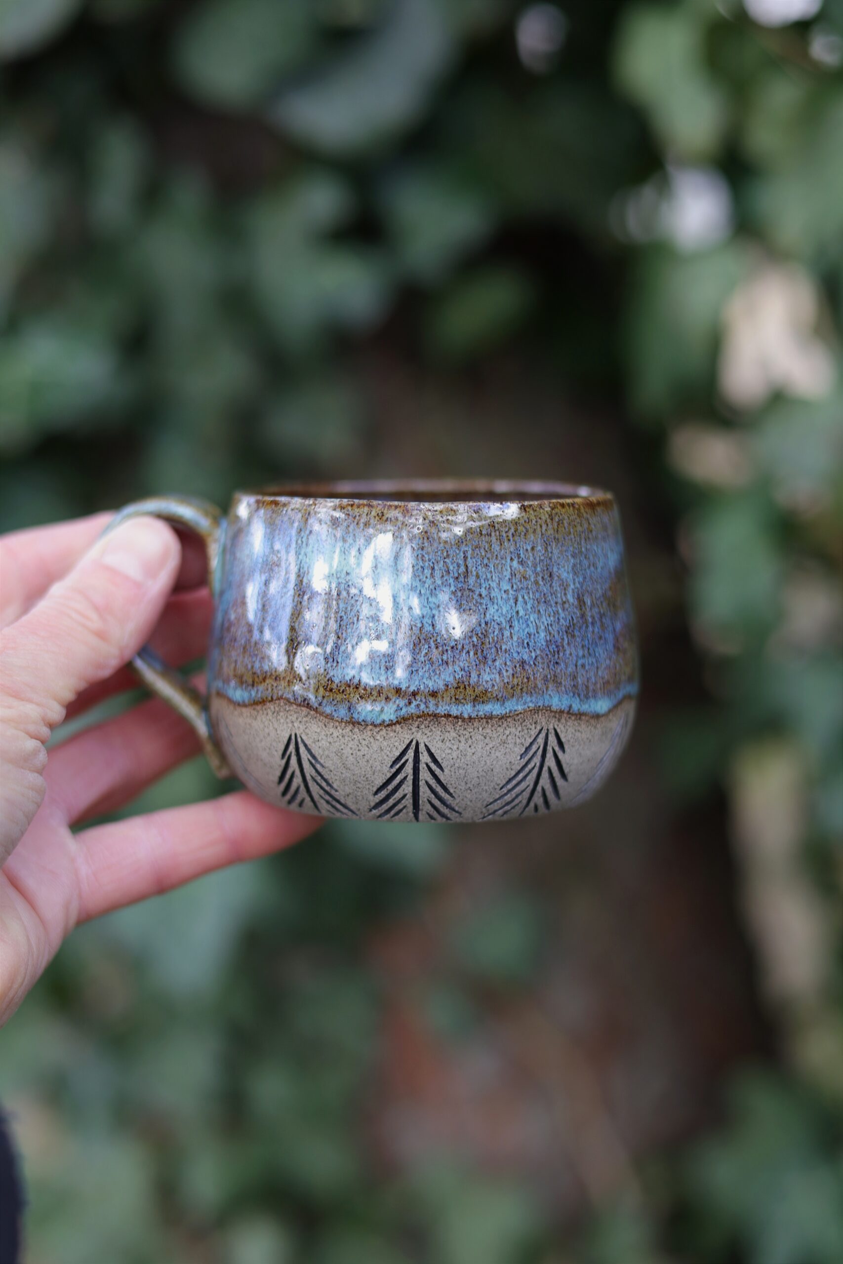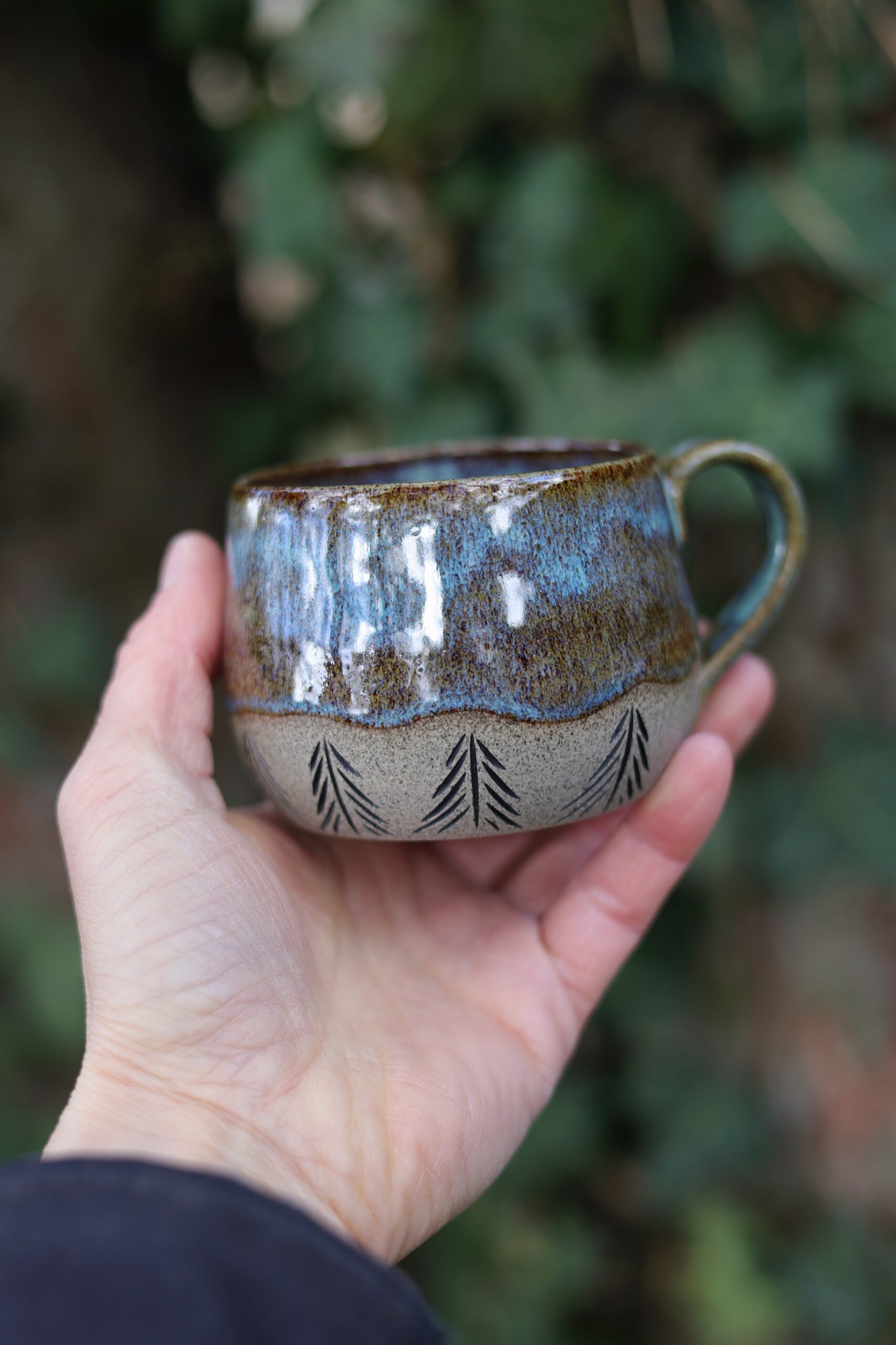 Kubek wykonałam na kole garncarskim z szarej gliny. Nie jest idealny i posiada ślady moich rąk. Poszkliwiony został szkliwem przeznaczonym do kontaktu z żywnością oraz wypalony w wysokiej temperaturze odpowiedniej do użytej gliny. Nie ma dwóch takich samych kubków, mogą delikatnie różnić się od siebie pojemnością, kształtem, wzorem i efektami na szkliwie. Kolor szkliwa może nieznacznie różnić się od tego na zdjęciach. Ceramikę można myć w zmywarce, ale by dłużej cieszyć się pięknym szkliwem zalecam mycie ręczne.