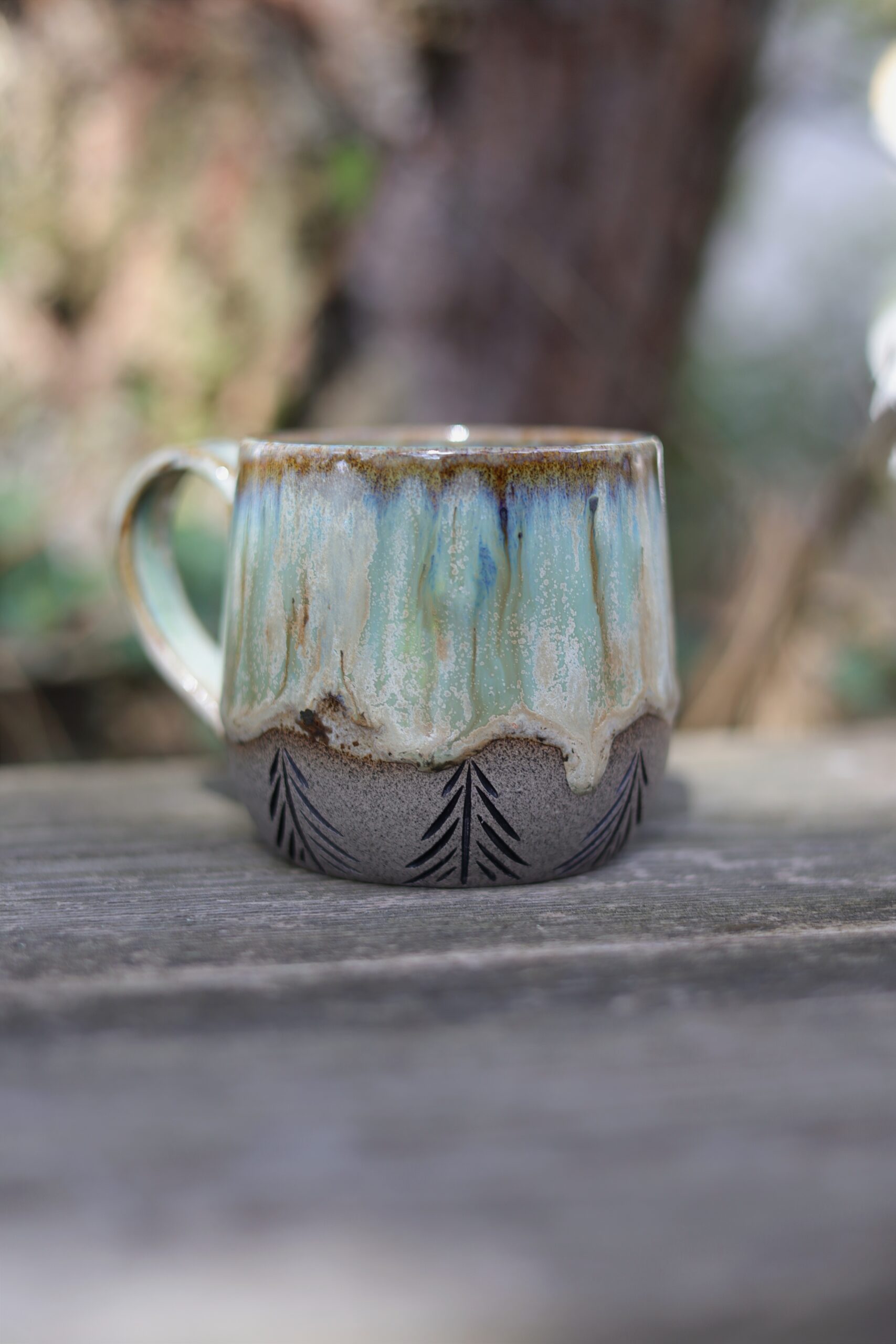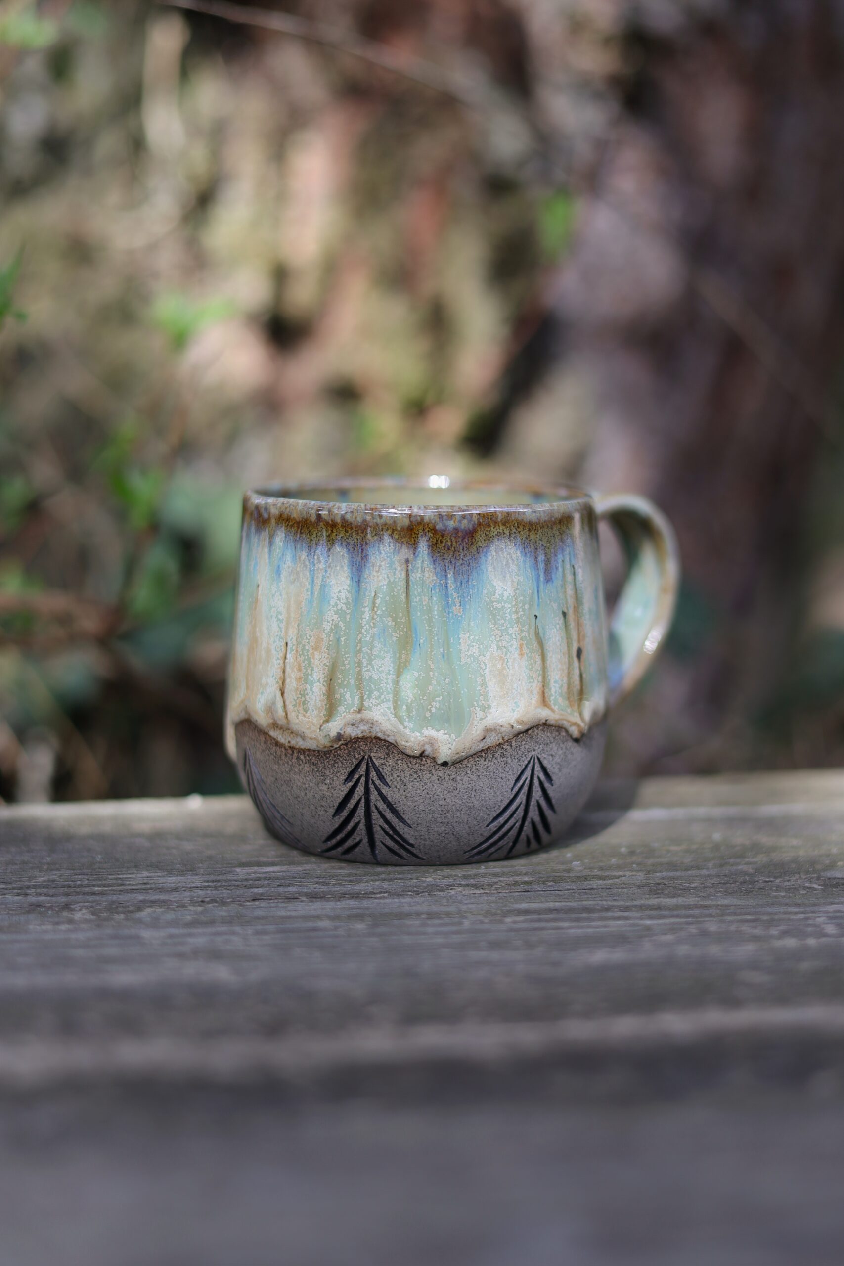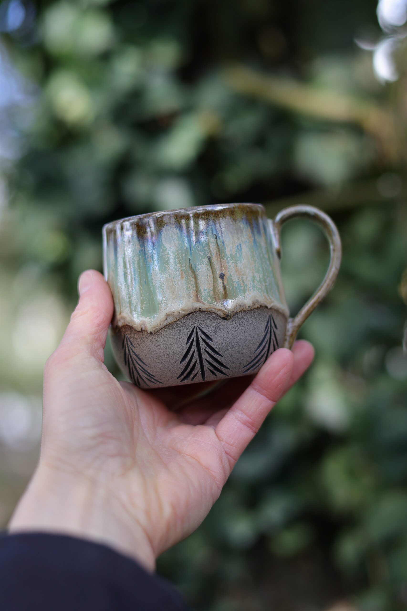 Kubek wykonałam na kole garncarskim z szarej gliny. Nie jest idealny i posiada ślady moich rąk. Poszkliwiony został szkliwem przeznaczonym do kontaktu z żywnością oraz wypalony w wysokiej temperaturze odpowiedniej do użytej gliny. Nie ma dwóch takich samych kubków, mogą delikatnie różnić się od siebie pojemnością, kształtem, wzorem i efektami na szkliwie. Kolor szkliwa może nieznacznie różnić się od tego na zdjęciach. Ceramikę można myć w zmywarce, ale by dłużej cieszyć się pięknym szkliwem zalecam mycie ręczne.