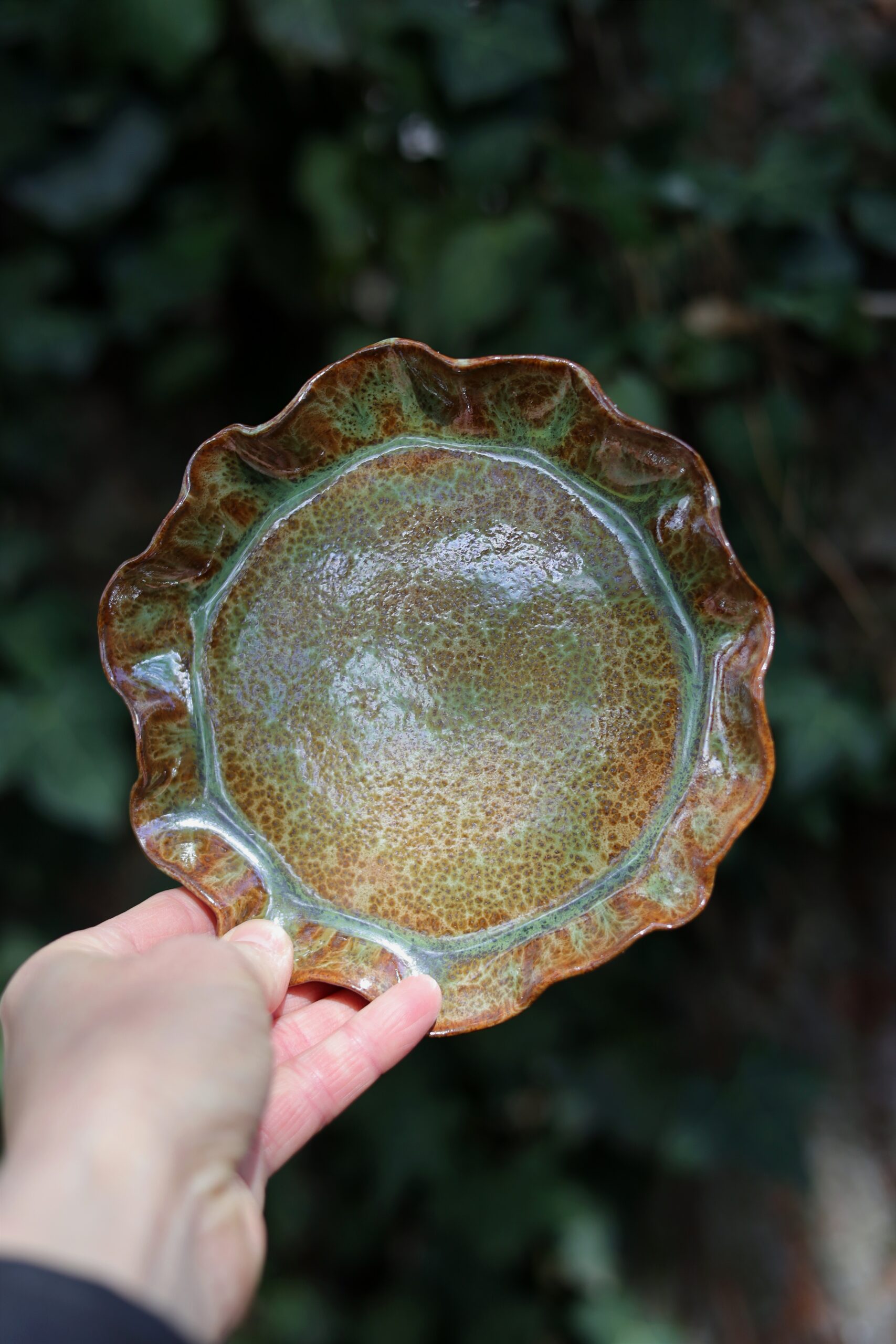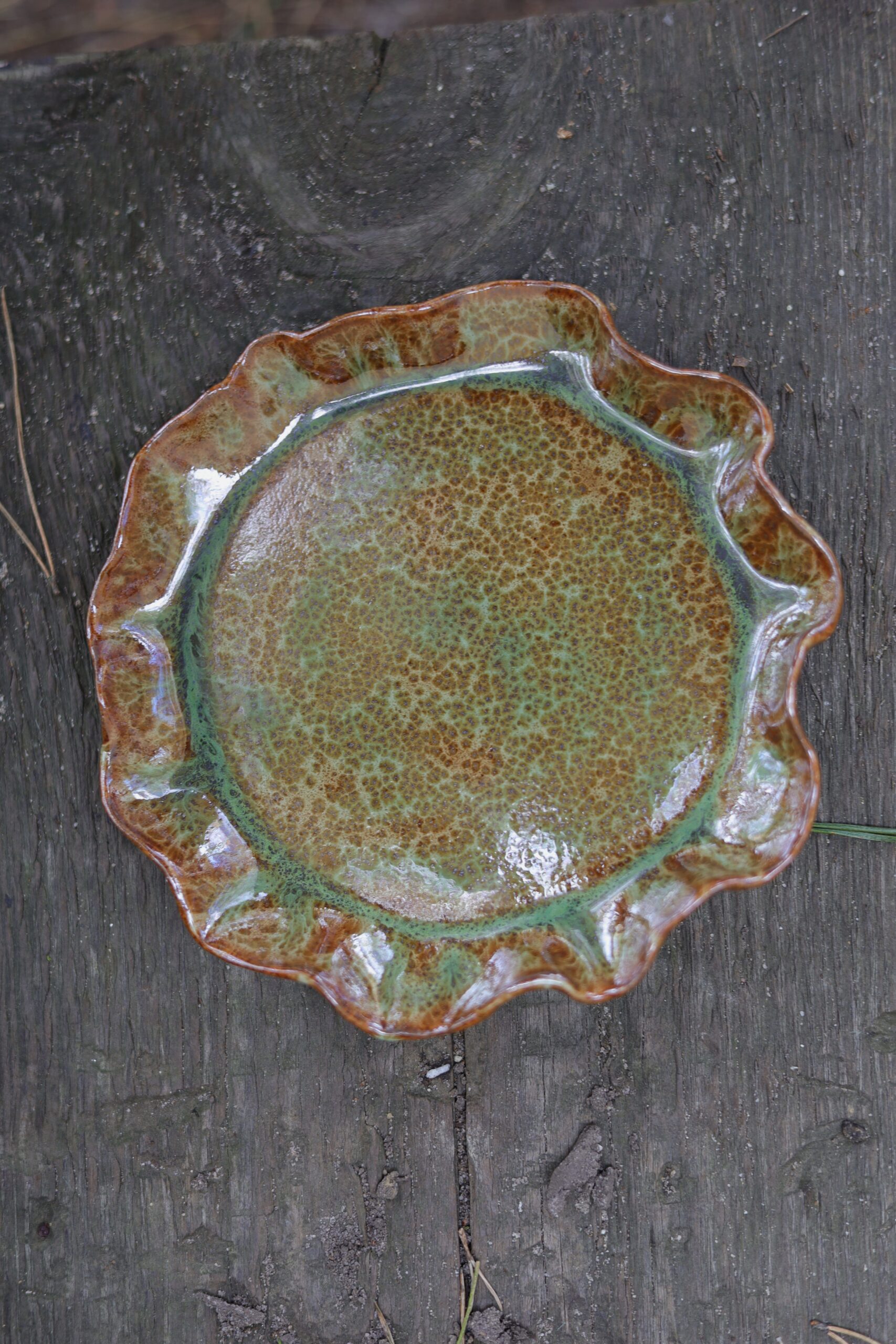 Talerz wykonałam metodą z płata z beżowej gliny. Nie jest idealny i posiada ślady moich rąk. Poszkliwiony został szkliwem przeznaczonym do kontaktu z żywnością oraz wypalony w wysokiej temperaturze odpowiedniej do użytej gliny. Nie ma dwóch takich samych talerzy, mogą delikatnie różnić się od siebie pojemnością, kształtem, wzorem i efektami na szkliwie. Kolor szkliwa może nieznacznie różnić się od tego na zdjęciach. Ceramikę można myć w zmywarce, ale by dłużej cieszyć się pięknym szkliwem zalecam mycie ręczne.